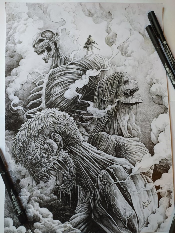 Fanart de Sandra Rush qui se débrouille toujours bien. Et parce qu’il y a la présence du trio Rivaï-Zoé-Smith et du titan bestial (disons que les moments avec ces perso sont peut-être ceux que j’ai le plus apprécié dans cette série)